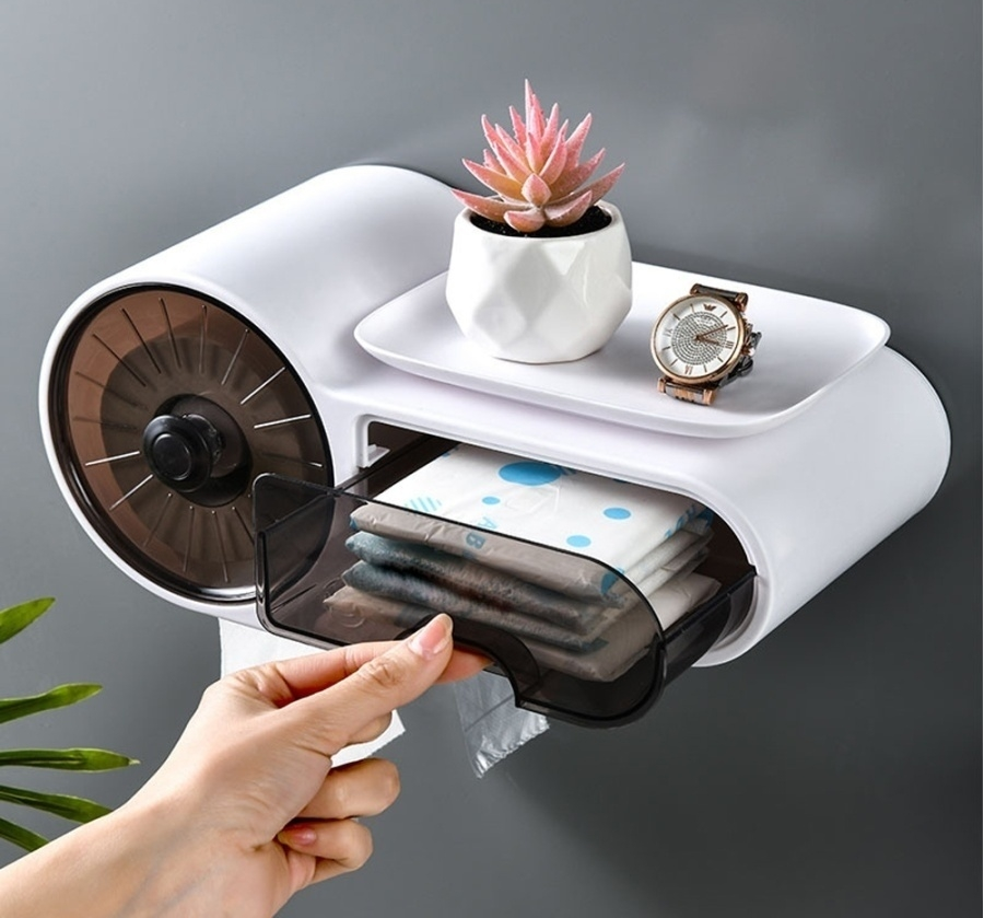 Тримач для туалетного паперу має герметичне відділення для рулону туалетного паперу та відсік для пакетів, а також висувну шухляду для предметів гігієни.